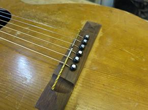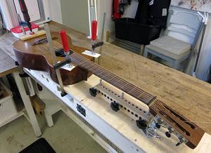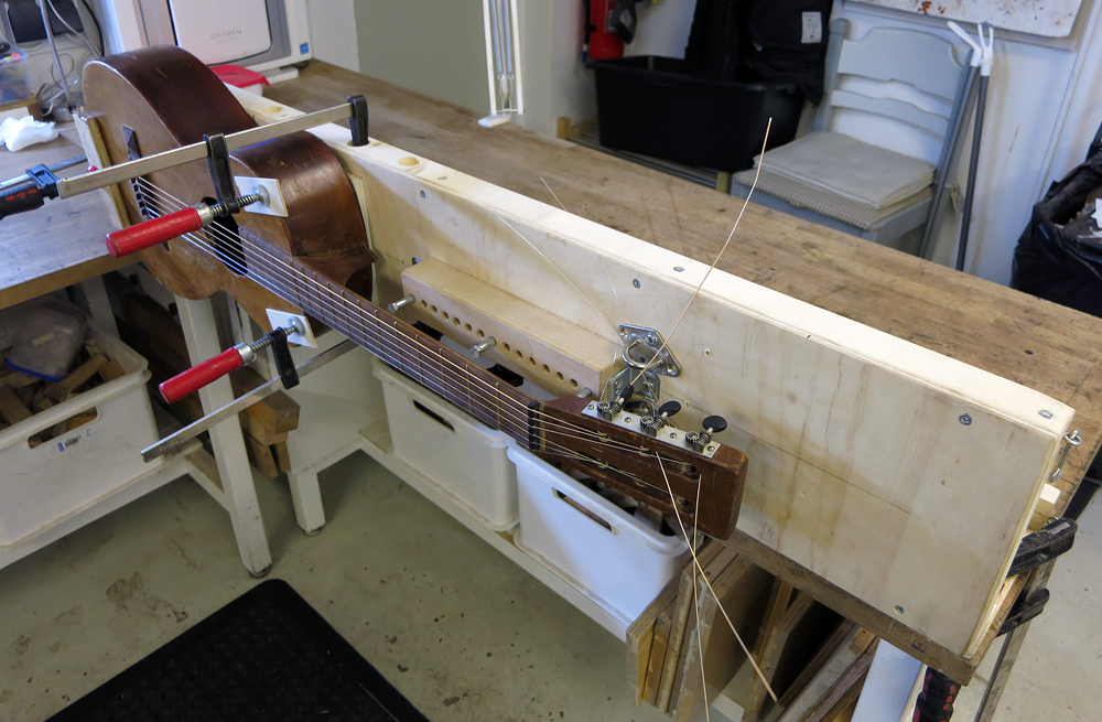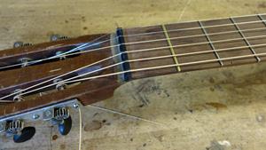 Lite bilder på ”bluesgitarren” som har en mjuk alhals. Gitarren strängas upp med temporärt justerad översadel och lämpliga borrar som stallben. 1:a och 12:e bandet är riktiga band, övriga är bara till för att fylla ut bandskårorna.