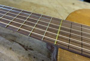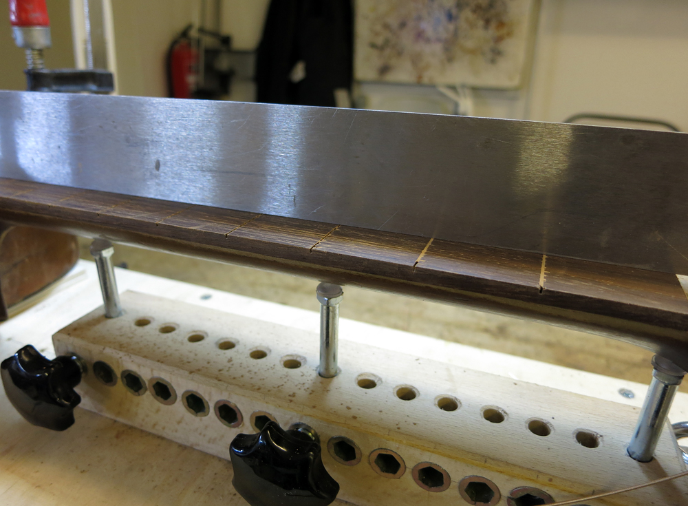 På den här blev greppbrädan inte helt rak med uppspända strängar, jag kunde med nöd och näppe pressa in det tunnast bladmåttet på 0.05 mm under min raka linjal på 6:e bandet. Perfekt 🙂