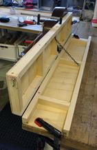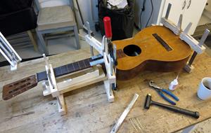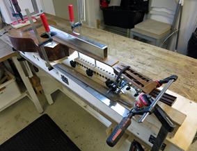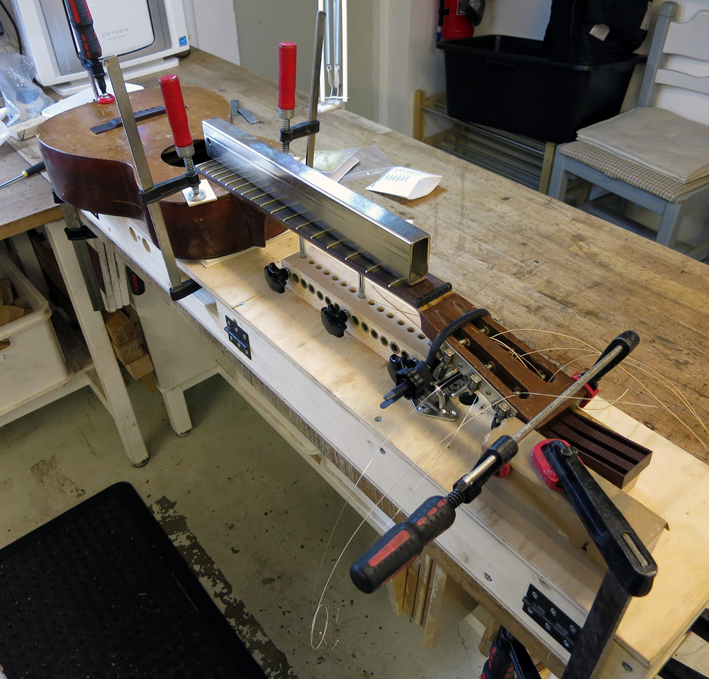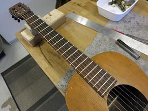 Med strängarna och översadeln av planslipas greppbrädan med en absolut rak stålprofil med ett självhäftande sandpapper. Spänner också fast huvudet med tvingar så att allt är stabilt. När greppbrädan är helt plan och gitarren lossas från jiggens järngrepp har man en greppbräda som har en negativ relief i vila men som blir rak när man strängar upp den!