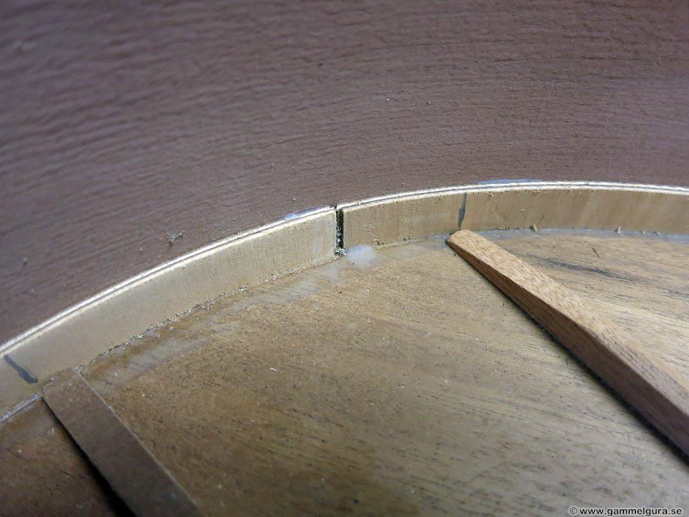 Ägnade lite tid efter jobbet för att ta isär botten. Bottenlisten, som var gjorda av två lager lönnfaner, fräste jag bort för att komma åt skarven mellan botten och kerfing. Den verkar vara limmad med Titebond eller kanske vanligt snickarlim, lite svårjobbad men inte omöjlig då limmet ger efter för värme och vatten. Jag fick isär botten bra för att vara mahogny, det är ett löst trä med en konsistens som liknar knäckebröd som brukar vara väldigt svår att lossa om limmet inte är hudlim. Att det inte fanns några bottenribbor underlättade. Fick också limma på ett par lösa bitar vid de två klossarna där fogen inte släppte i limmet.
