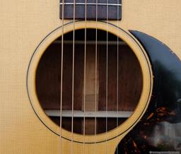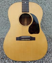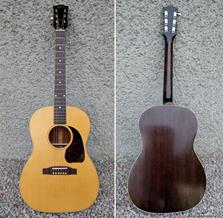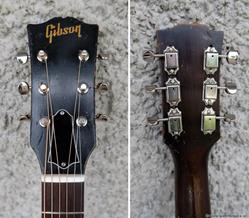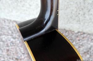 Är man gitarreparatör får man reparera gitarrer. Får ofta sidoprojekt i form av ombandning, justering etc. Ibland är det värre än så. Den här Gibson gitarren kom med ett utbytt lock i plywood… inte det man vill se! Tillverkade ett nytt lock i Svensk gran (fick locket av Per Marklund) och gjorde mitt första ljudhål + rosett. Annars ett moment jag aldrig stöter på med de gamla gitarrerna. Fick även hjälp av Per att cellulosaspraylacka locket i en vintage orange färg. Tillverkade ett stall, ribbade upp locket och limmade halsen på plats. Halsfoten var sprucken på två ställen, två rundstavar i björk borrades in i halsfoten över sprickorna och limmades med epoxylim. Nya stämskruvar. Bandade om, planslipade brädan samt justerade upp ny översadel och stallben i ben. Ett gäng vintage strängpinnar och ändplugg passade bra på gitarren.