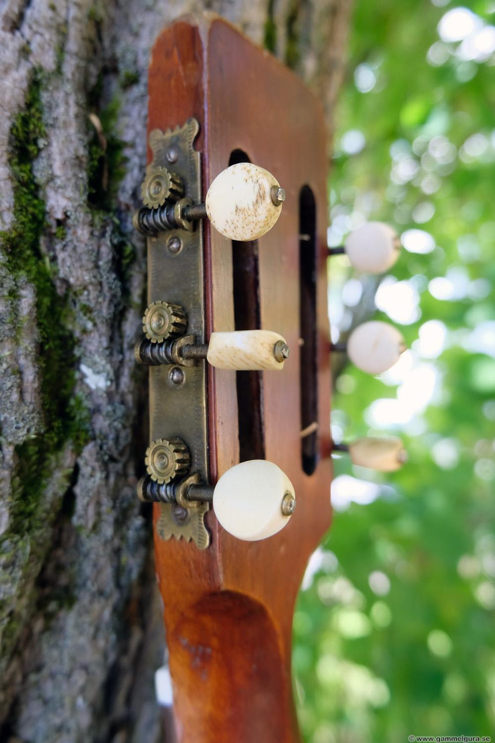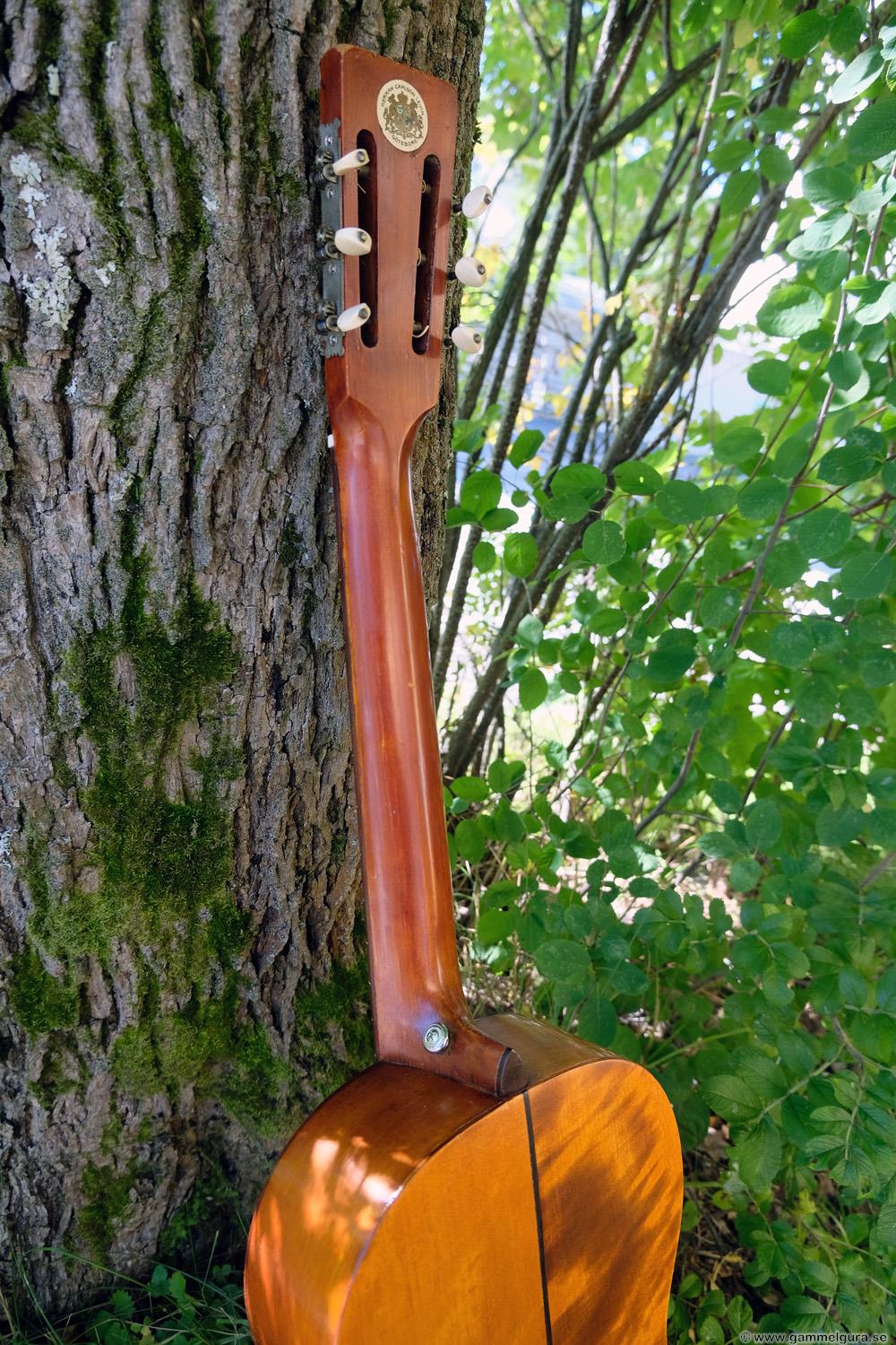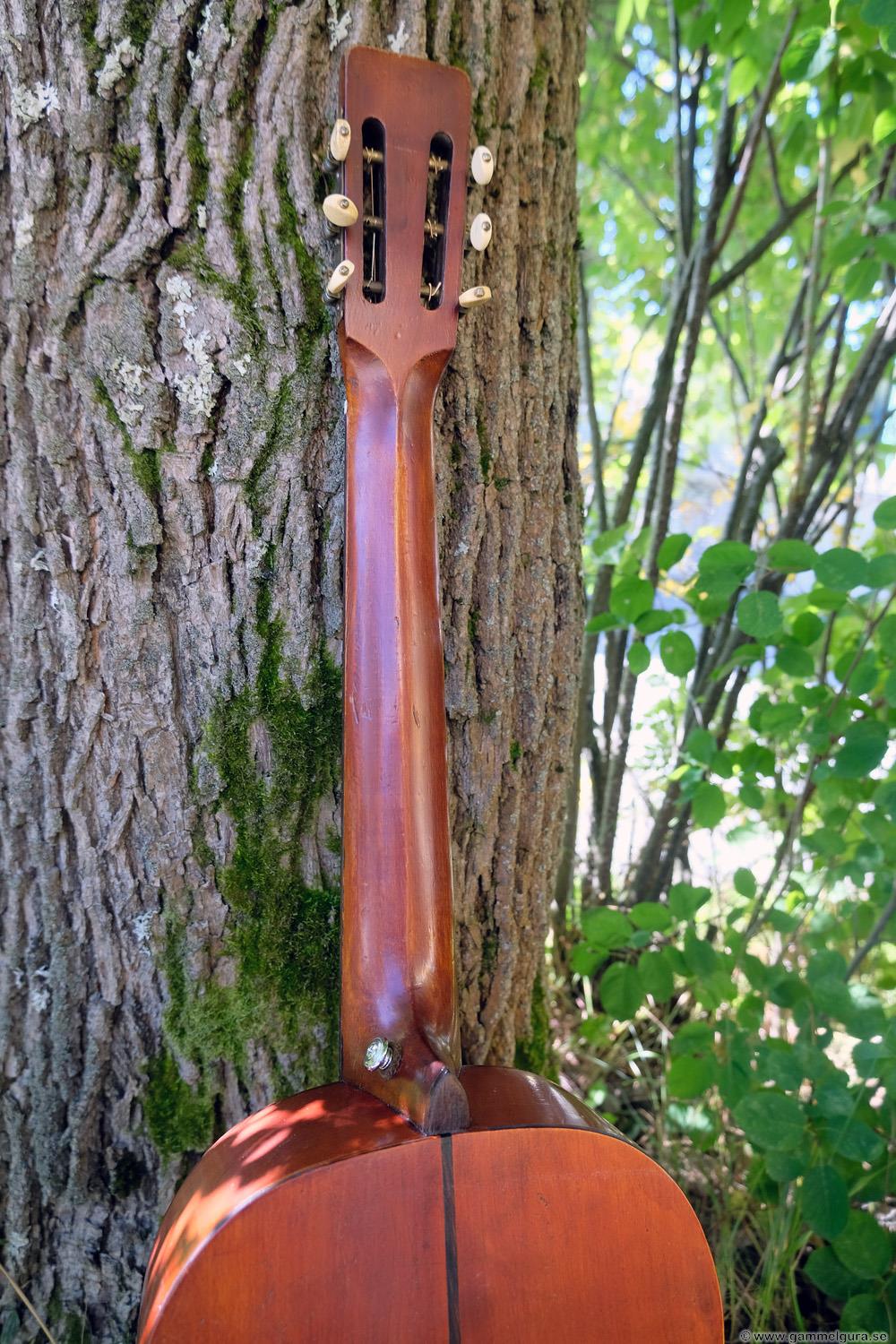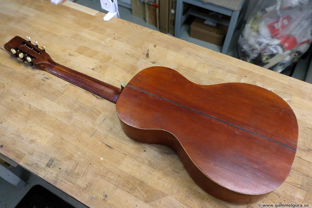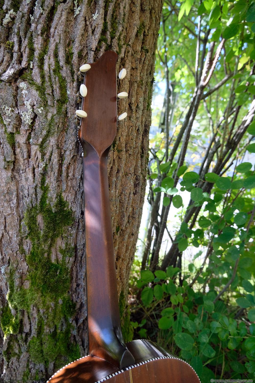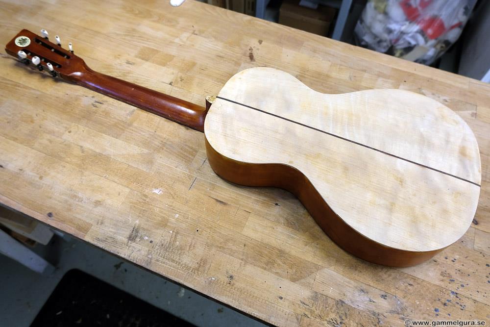 Börjar med mahognyskutan. Björn har alltid tyckt om att spela på den här när han hälsat på hemma hos mig. Det är också en av de vackraste gitarrer jag haft i min ägo. Köpte den på amerikanska eBay för nära 10 år sedan. Det speciella huvudet är snyggt men väldigt opraktiskt när man ska byta strängar. Jag gjorde en av mina första renoveringar på den här utan att öppna upp den, men för att få det hela som det ska fick det bli en helt ny renovering med botten av.