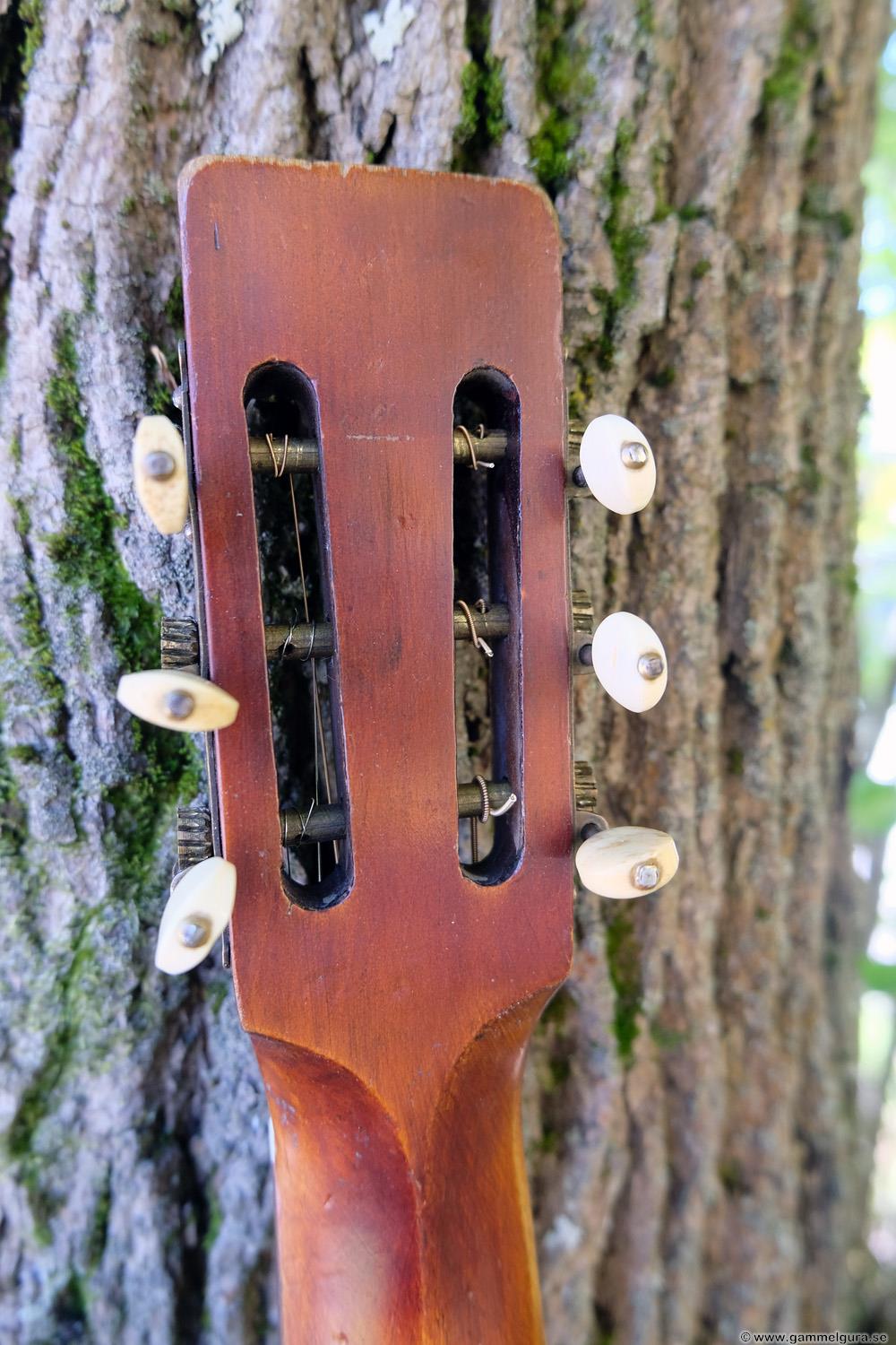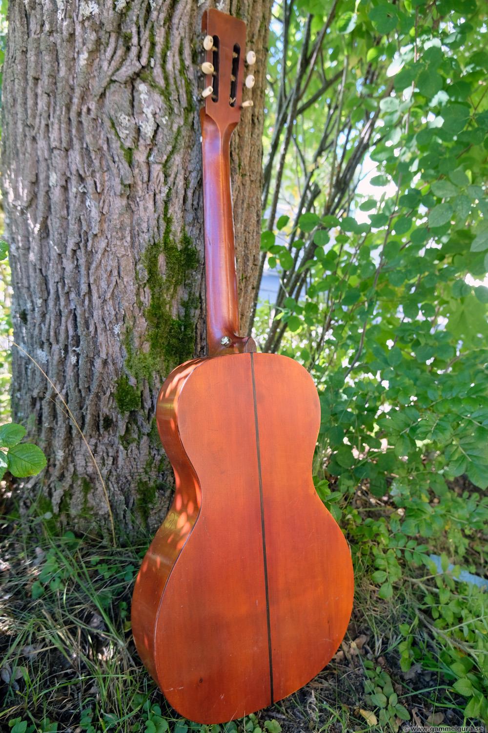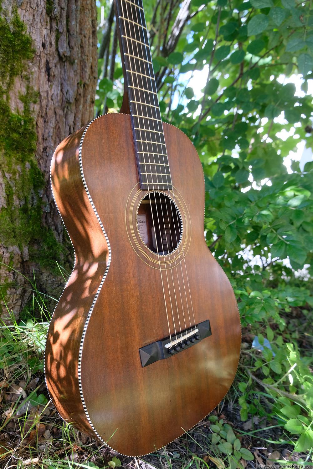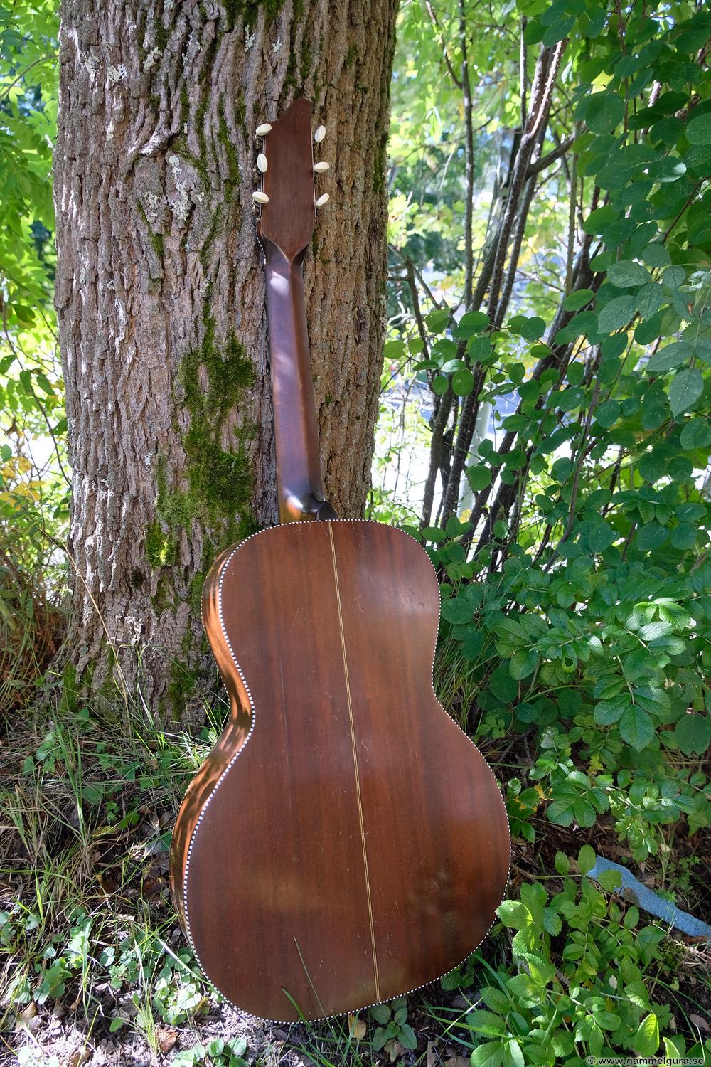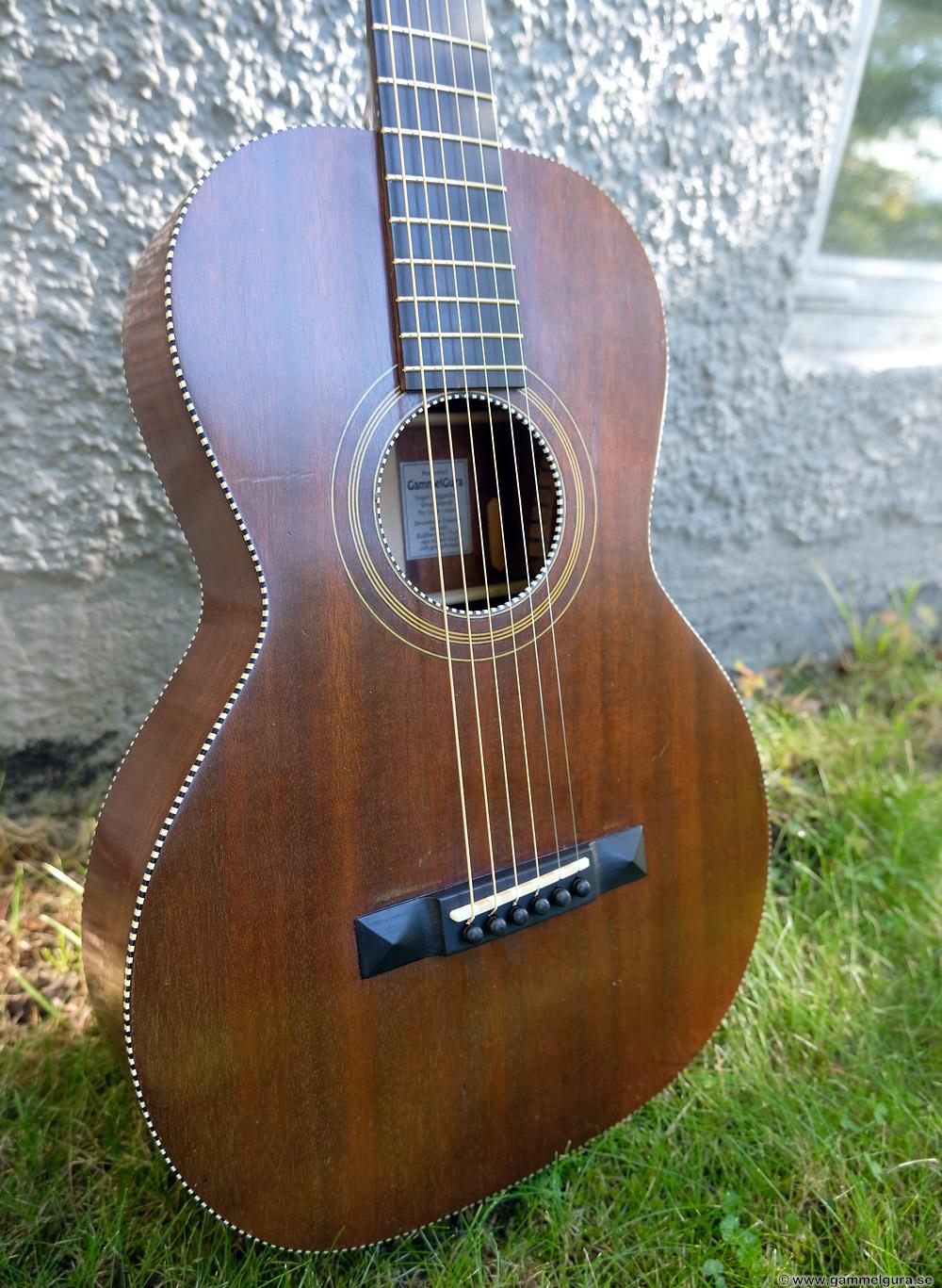 Börjar med mahognyskutan. Björn har alltid tyckt om att spela på den här när han hälsat på hemma hos mig. Det är också en av de vackraste gitarrer jag haft i min ägo. Köpte den på amerikanska eBay för nära 10 år sedan. Det speciella huvudet är snyggt men väldigt opraktiskt när man ska byta strängar. Jag gjorde en av mina första renoveringar på den här utan att öppna upp den, men för att få det hela som det ska fick det bli en helt ny renovering med botten av.