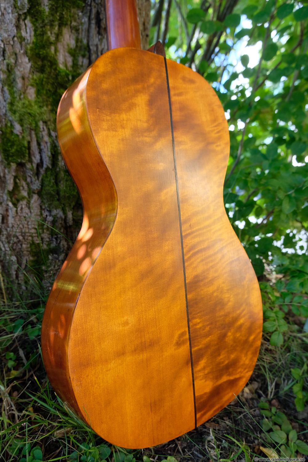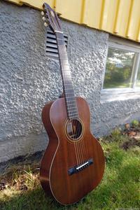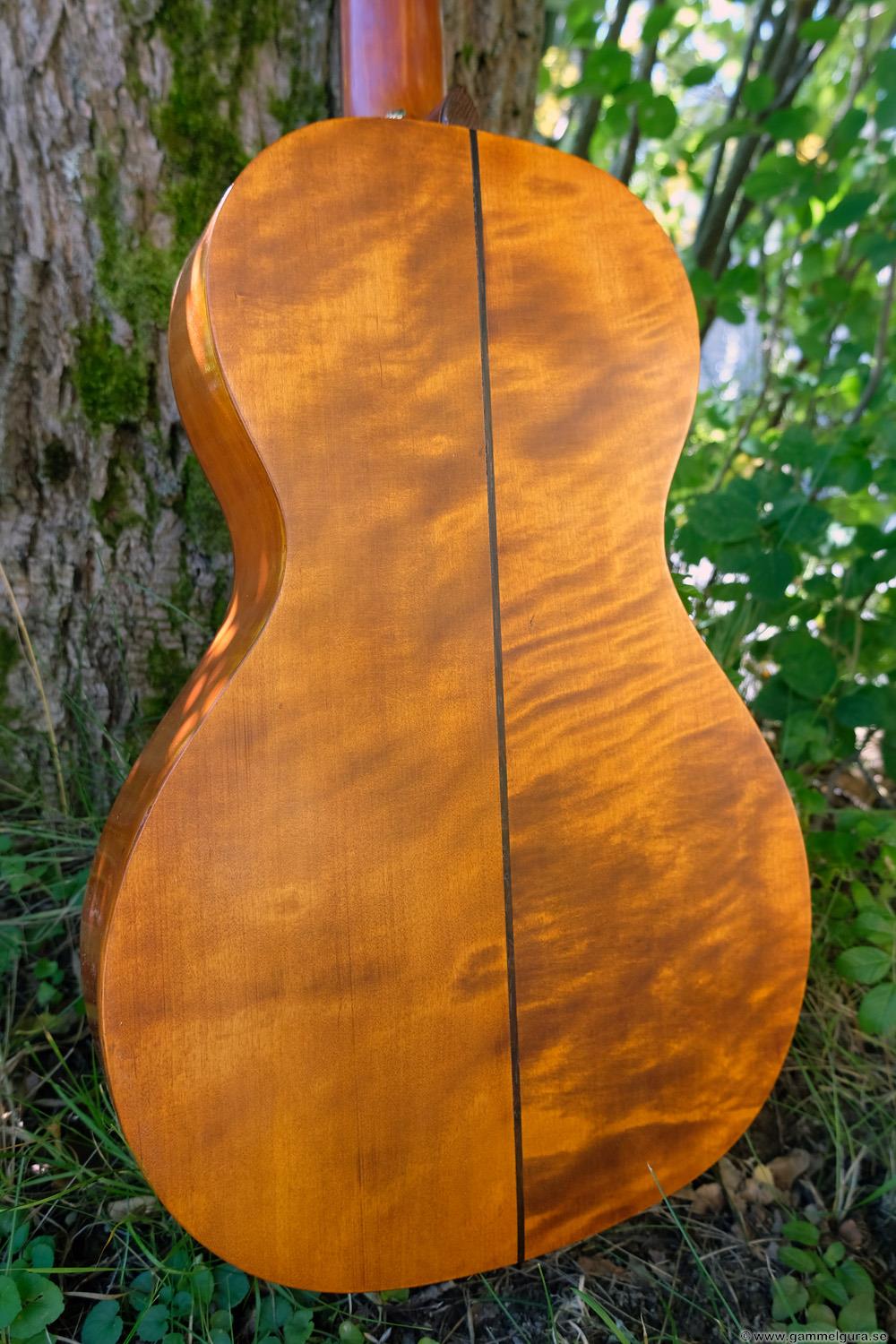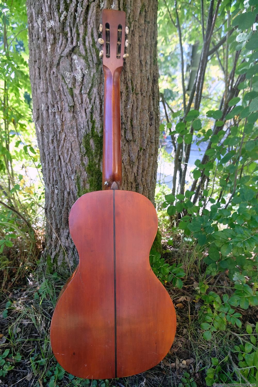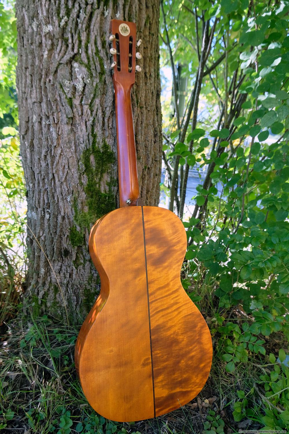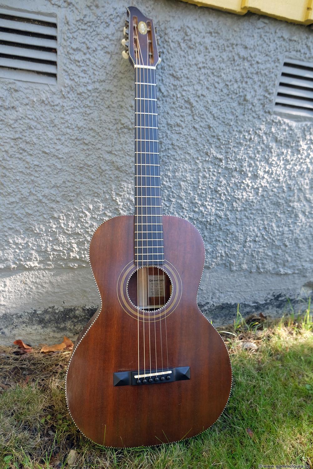 Börjar med mahognyskutan. Björn har alltid tyckt om att spela på den här när han hälsat på hemma hos mig. Det är också en av de vackraste gitarrer jag haft i min ägo. Köpte den på amerikanska eBay för nära 10 år sedan. Det speciella huvudet är snyggt men väldigt opraktiskt när man ska byta strängar. Jag gjorde en av mina första renoveringar på den här utan att öppna upp den, men för att få det hela som det ska fick det bli en helt ny renovering med botten av.