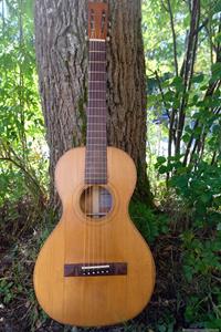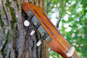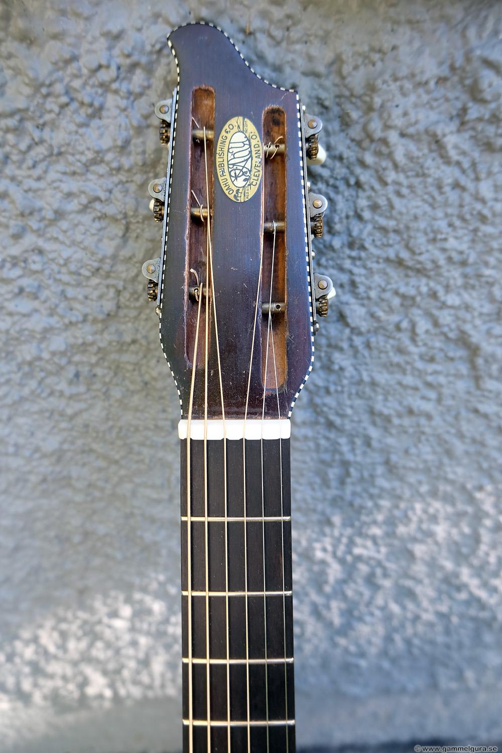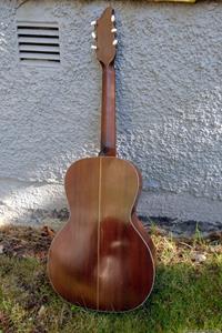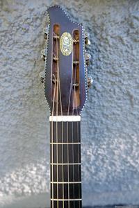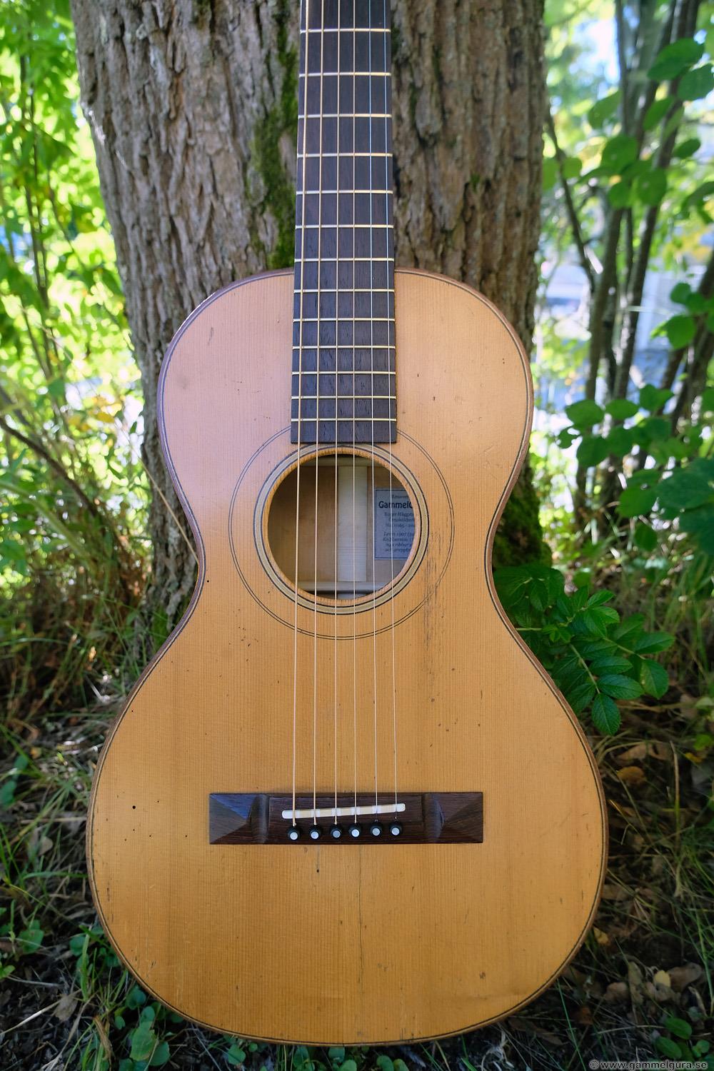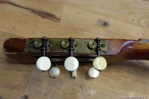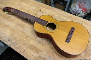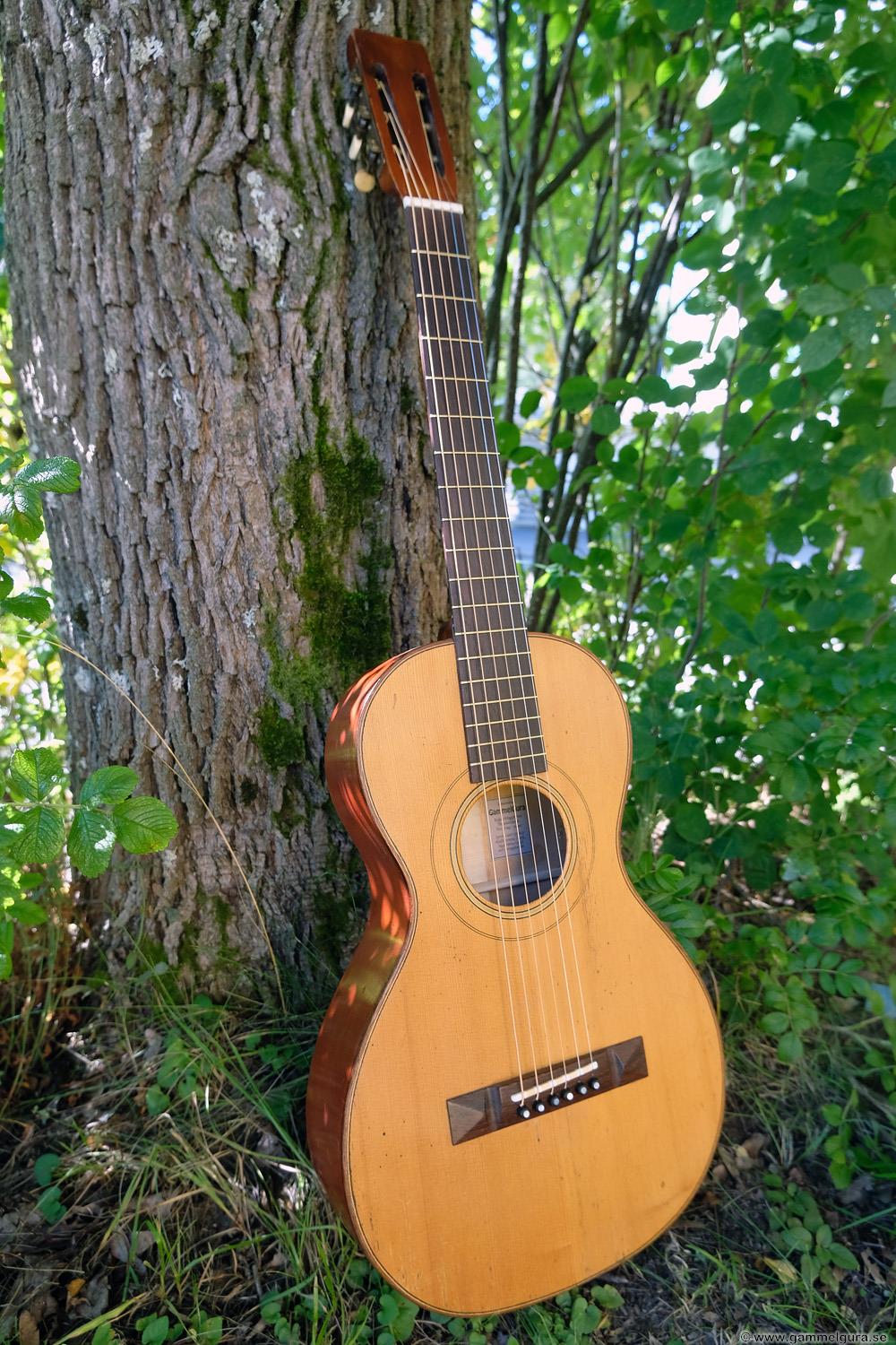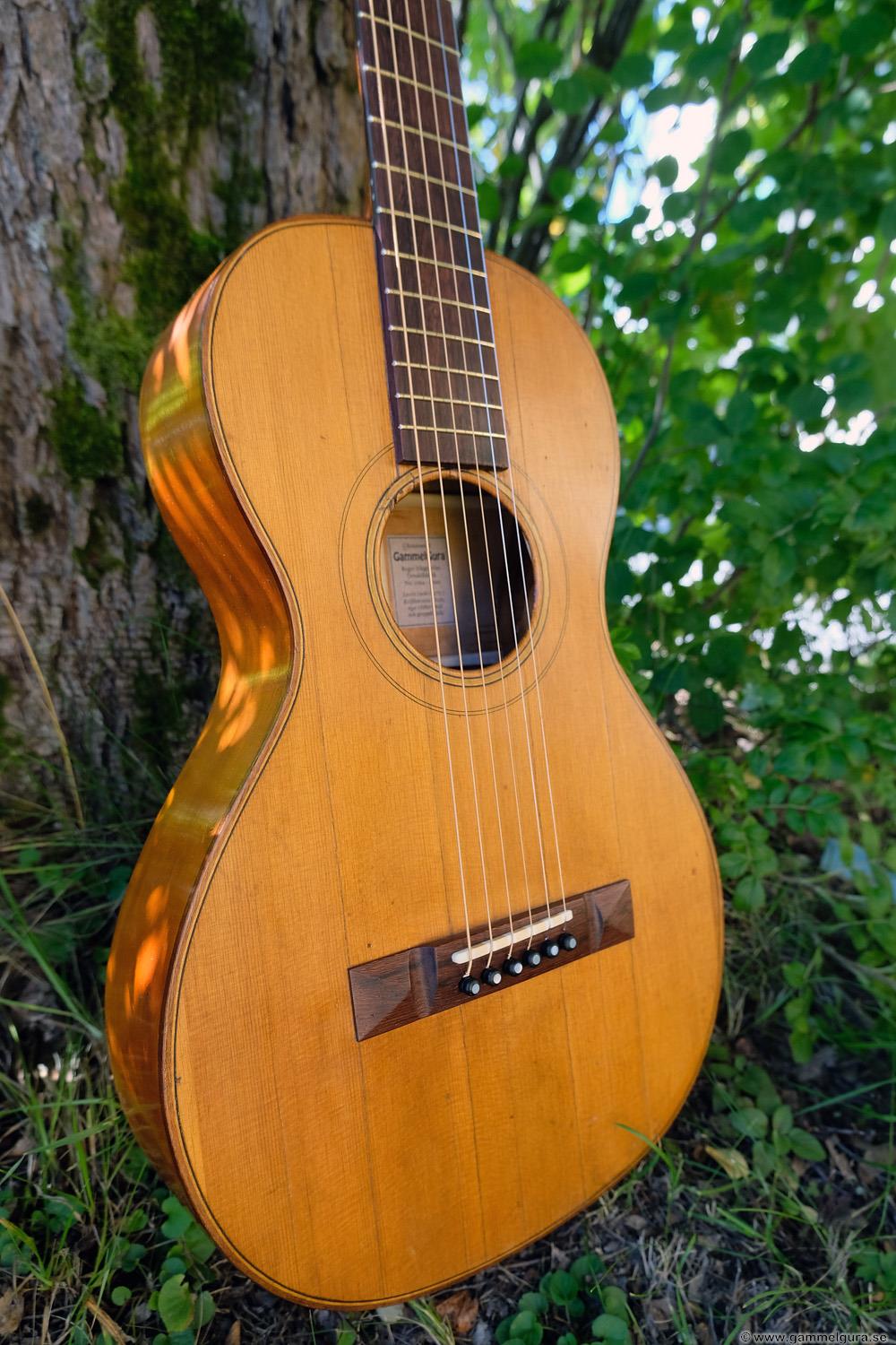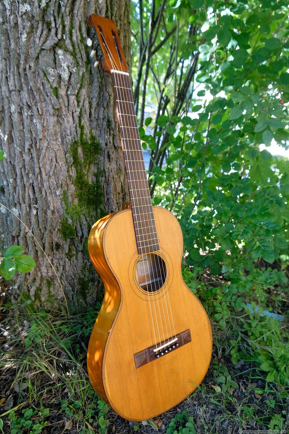 Börjar med mahognyskutan. Björn har alltid tyckt om att spela på den här när han hälsat på hemma hos mig. Det är också en av de vackraste gitarrer jag haft i min ägo. Köpte den på amerikanska eBay för nära 10 år sedan. Det speciella huvudet är snyggt men väldigt opraktiskt när man ska byta strängar. Jag gjorde en av mina första renoveringar på den här utan att öppna upp den, men för att få det hela som det ska fick det bli en helt ny renovering med botten av.