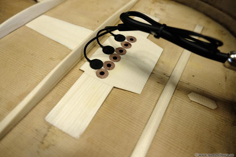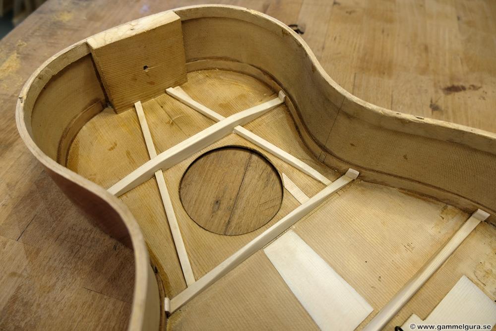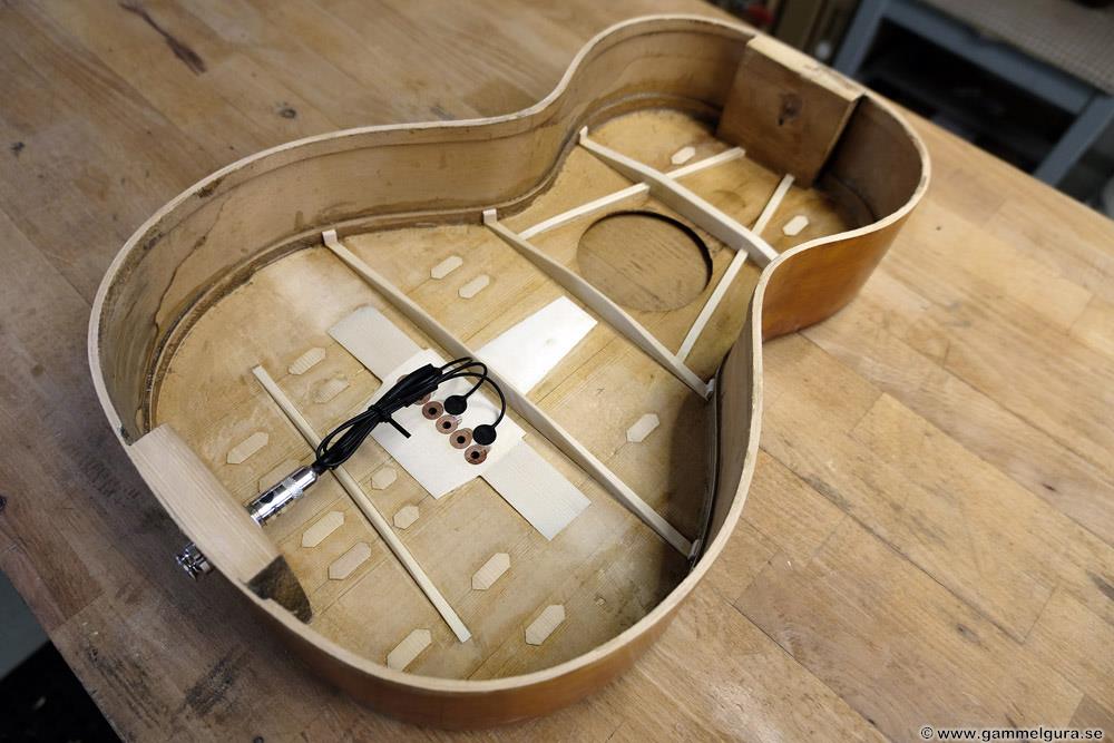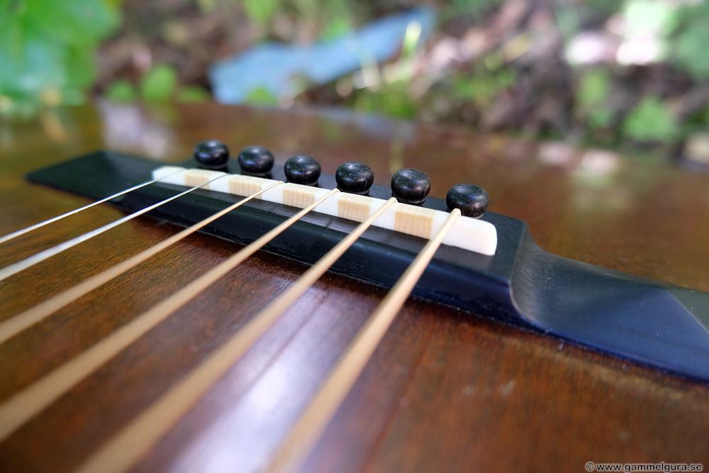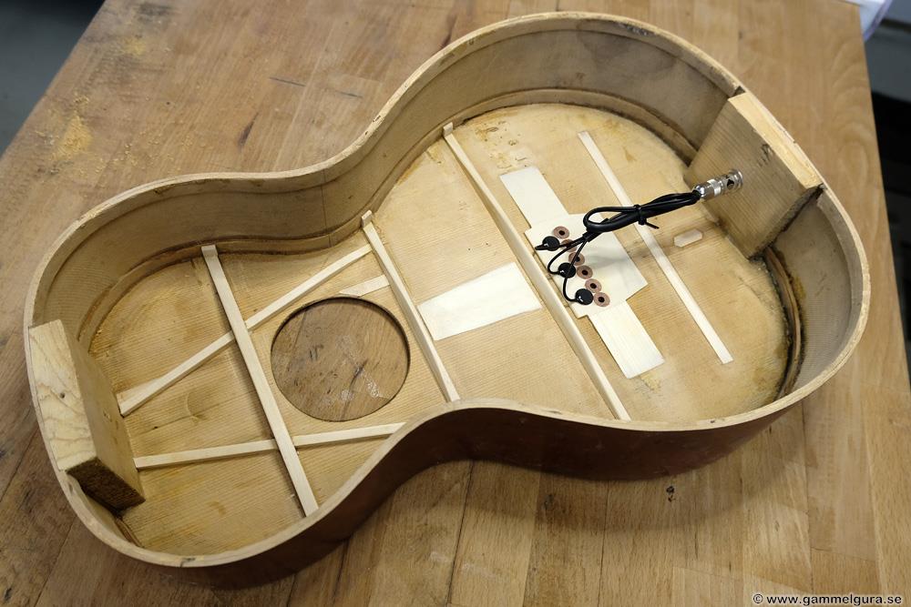 Ribbningen byttes ut och den fick stallplatta i gran och pluggar. Jag använde ett Stewmac pyramidstall i den gamla renoveringen, men hade hyvlat ned den på höjden då halsen inte sattes om. Hade ett oanvänt likadant pyramidstall som ersättning. Stämskruvarna fick vara original och de är helt OK även om nya är tightare.