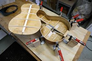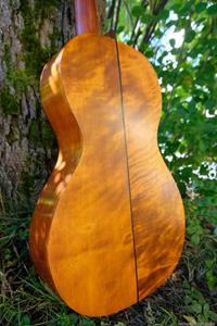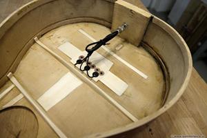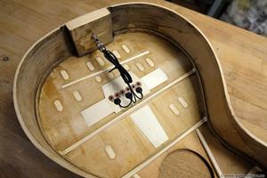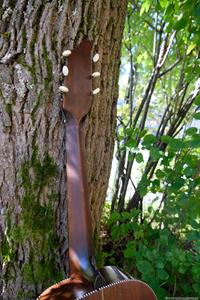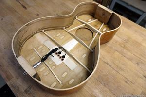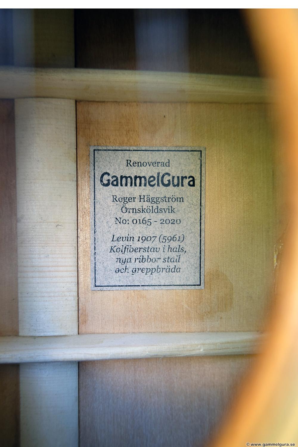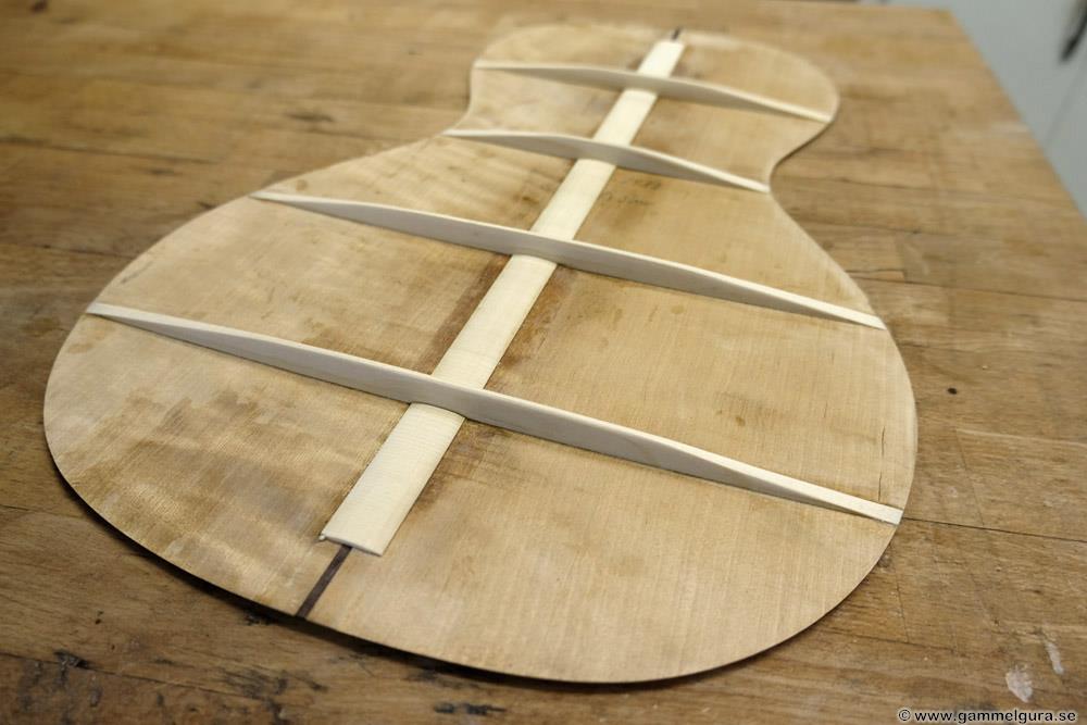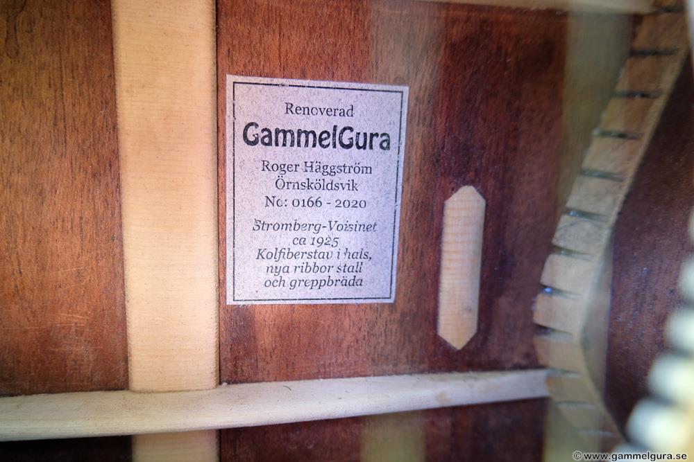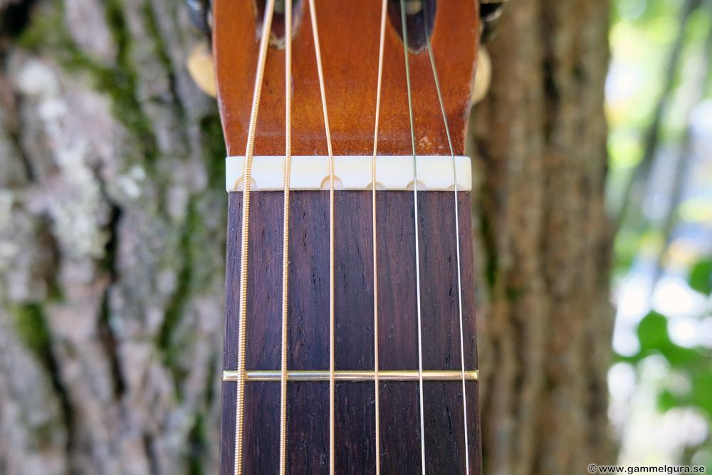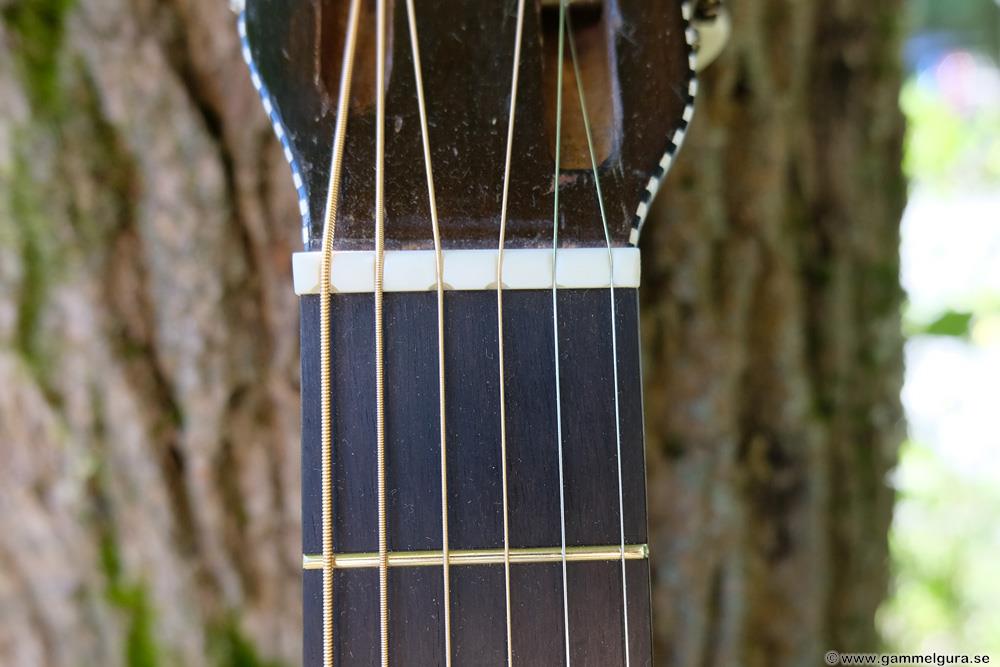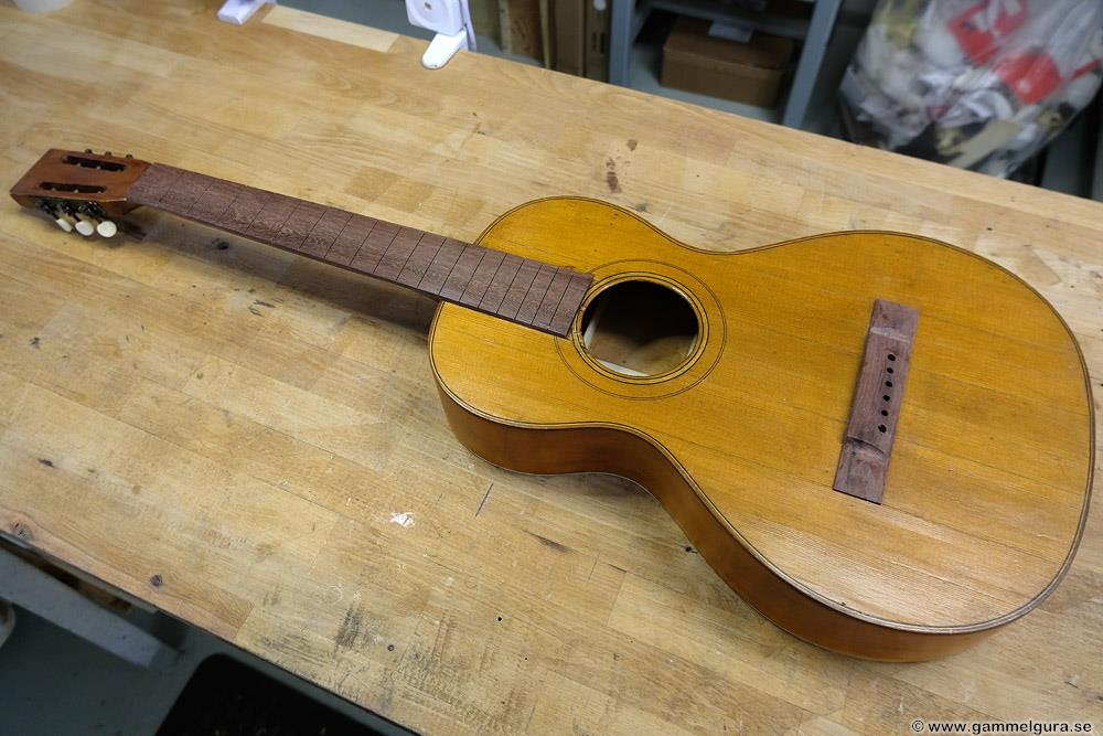 Greppbrädan i eboniserat fruktträ fick spettas lös och ersattes med en solid ebenholtsbräda. Det går aldrig att få lös såna här eboniserade greppbrädor, den kemiska processen förstörde all seghet i träet. Bandade på med nya EVO gold banden som numera är standard på alla GammelGura. En kolfiberstav monterades i halsen. Björn, som spelar fiol, trivs bäst med en hals som är inoljad och inte lackad. Tog bort lacken på halsens undersida, betsade och oljade in. Blev en väldigt skön yta att ta på 🙂