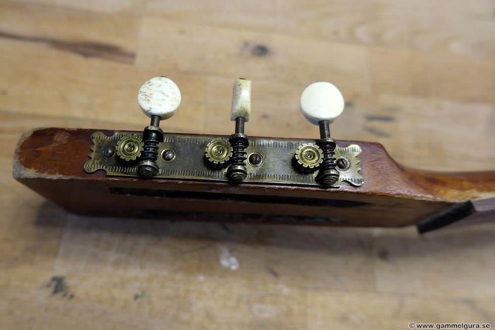 Fick som sagt två beställningar inom en vecka. Två fina gamlingar från 1906 och 1907. Båda i bra skick, men den från 1906 hade fått en renovering 1982 där man börjat sanda bort lacken på botten men inte gjort jobbet klart. Förutom det vanliga jobbet med en GammelGura fick jag för en gångs skull lacka om en trären botten. Både kunderna ville ha kvar original stämskruvar vilket är ovanligt. Men det visade sig att stämskruvarna fungerade oväntat bra då de har snäckan under kuggen, vilket innebär att strängdraget pressar ihop kuggen och snäckan tightare.