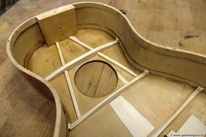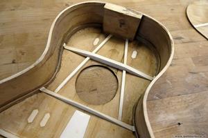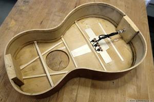 Lossade bottenbindningen försiktigt då det inte finns schackrutiga celluloidbindningar att köpa. Fick lös den hel och kunde såga lös botten i skarven med en tunn japansåg. Som alltid är bindningen ca 3 mm för kort efter man lossat den då den krympt på längden. Min erfarenhet är att mahogny är svår att sprätta lös utan sprickskador, speciellt på en gitarr med lim som sitter bra som på denna. Bättre att offra lite av kerfingen och såga lös botten runtom. Blev ändå några sprickor i den känsliga cellulosalacken på botten vid halsklossen, men det gick att dölja helt OK senare då jag lade på spritlack.