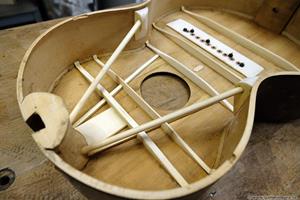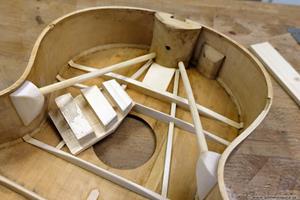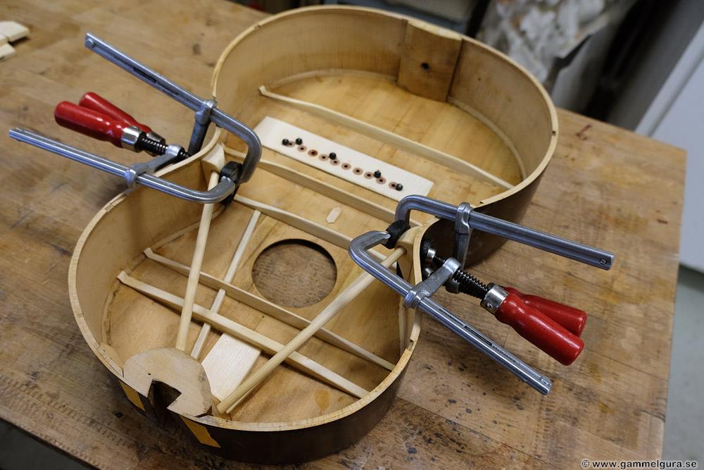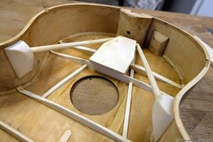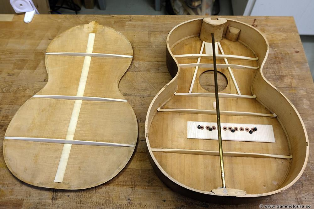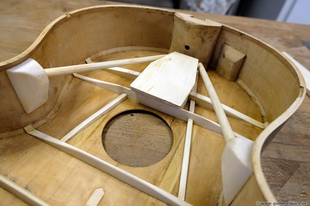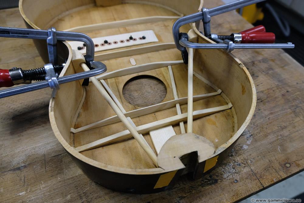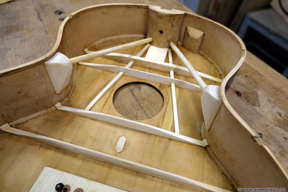Vi får se hur det hela funkar när gitarren är klar, det är första gången jag gör en flying buttress, men det finns många moderna byggare som använder sig av den. Är i alla fall övertygad om att locket blir mycket starkare och låter bättre än med originalets mässingsstång. Hela locket nedanför ljudhålet, som ger det mesta av gitarrens ljud, är nu fri att vibrera.