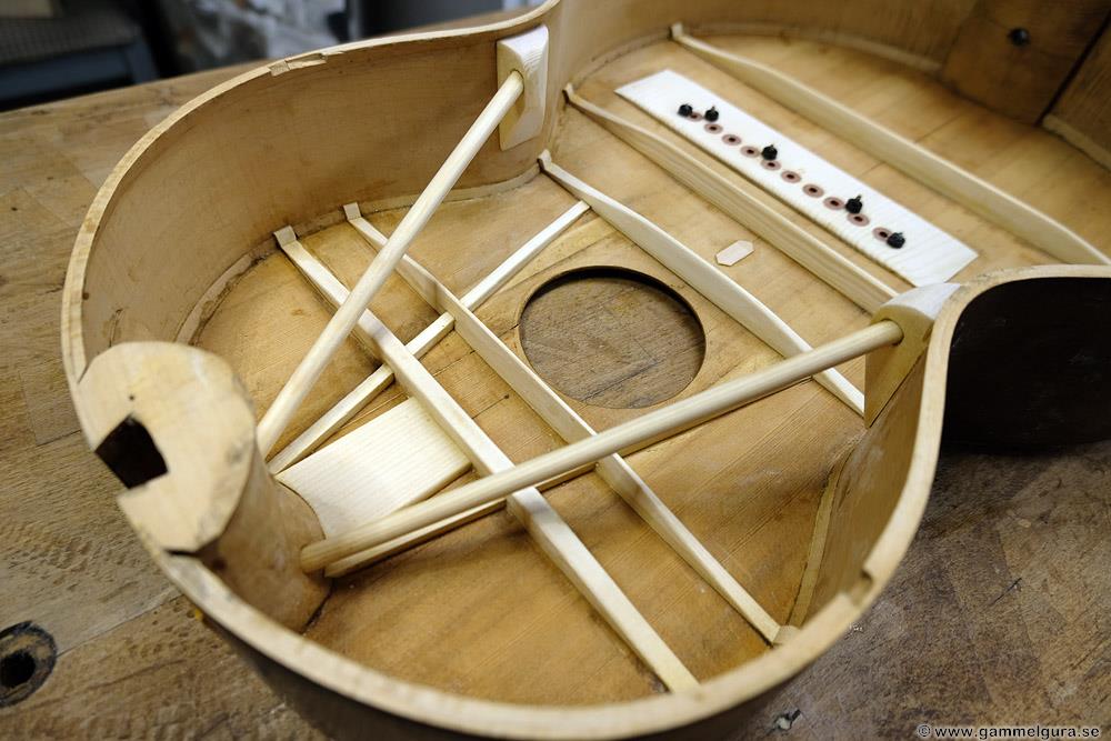 Efter ett samtal med kunden tog jag bort mässinsstången. För att inte tappa hållbarhet i den lätt byggda harpgitarren monterade jag istället två rundstavar mellan halskloss och sargen för att styva upp den övre delen av gitarrlocket. Strängdraget vill rotera halsklossen mot ljudhålet, rundstavarna utsätts för tryckande kraft och tillåter inte halsklossen att rotera inåt. Locket blir mycket starkare vid ljudhålet och ska inte kunna deformeras av de 10 strängarna.