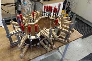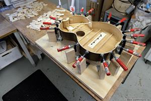 För att kunna banda på de sista banden gjorde jag ett mothåll för den komplicerade övre delen av gitarrlocket. Med botten av är det lätt att göra en liten jigg.