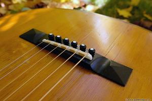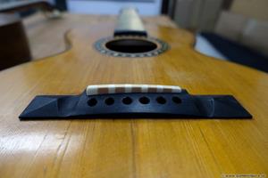 Gitarren plockades isär utan problem. Kunden ville ha ebenholts i en greppbräda med 16″ radius istället för den platta originalbrädan. Jag tillverkade också ett nytt pyramidstall i ebenholts som gjordes lite bredare än originalet för att få plats med ett intonerat stallben.
