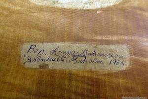 En orsak till det relativt fina skicket var en tidigare renovering 1983, jag har lite svårt att läsa vad som står på etiketten. Renoveringen hade gjort med rätt lim och lack, möjligen hade den rensats på originallacken men helt klart fått ett par varv ny spritlack. Stämskruvarna verkade vara i bra skick, men det visade sig att stämskruven för G strängen kuggade över, så de ersattes med nya. Stallet var smalt och inte riktigt ett pyramidstall och nästan jämntjock över hela längden.