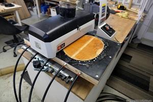 Locket hade bra tjocklek, men botten var tjockare än den behövde vara. För att sanda ned den till strax under 3 mm fick jag offra lagningsetiketten. Trots att botten hade en kupad form gick det bra att slipa i min vakuumjigg efter att ha fuktat upp botten på insidan så den låg platt mot jiggen.