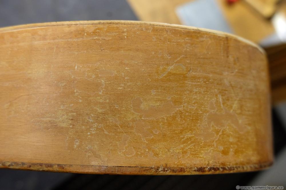 Stallet var borta men hade lämnat spår efter sig i lacken på locket. Botten hade krympt och delar av limfogen var lös, men den var annars i bra skick utan sprickor eller andra problem förutom ristningarna på baksidan (bland annat årtalet 1972). Stämskruvarna var inte de bästa och de byttes ut till nya.
