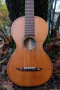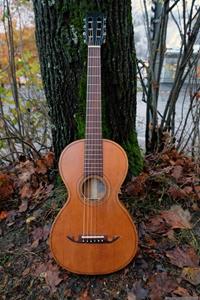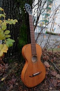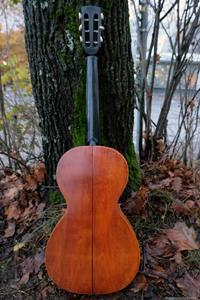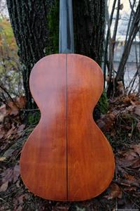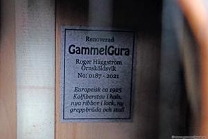 Jag har länge saknat en färdig GammelGura i lokalen, dels för att spela på själv emellanåt, men främst för att kunna visa besökare och kunder hur gitarrerna kan låta. Den här var tänkt som en gitarr för lokalen och jag valde medvetet ut ett väldigt enkelt objekt, en Europeisk parlor från ca 1925 som är så enkel man kan tänka sig. Den hade också lite ristningar i lacken på baksidan, vilket aldrig är ett bra försäljningsargument. Den var extra liten och antagligen den smalaste sargen jag sett på en liknande parlor. Jag brukar kunna pressa in handen genom ljudhålet på även den minsta parlor, men inte på den här!
