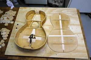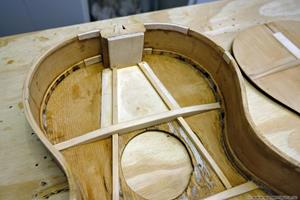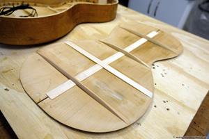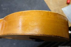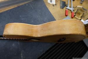 När den plockades isär såg jag att botten var alldeles för tjock. Med hjälp av min vakuumjigg och valsputs plockade jag av 1 mm på tjockleken. Jag fick kapa av spetsen på halsfoten lika mycket för att den inte skulle sticka ut. Även locket var lite väl tjockt och ca 3,5 mm. Av nån anledning glömde jag att tunna ned locket innan ribborna limmades, men det visade sig senare att den lät väldigt bra trots det! En fördel är att locket är stabilt och kan säkert klara även vanliga 0.12 strängar
