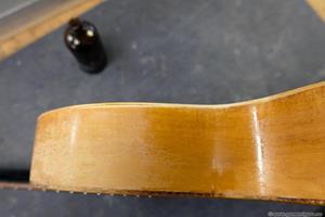 Den här hade en torr och fnöskig spritlack som det ibland kan vara på liknande gitarrer. Jag vill ogärna plocka bort originallacken, vilket egentligen är den enda lösningen för en uttorkad spritlack. När man lackar på ny spritlack dämpas de vita dingsen, men lacken blöter inte upp alla skrymslen och vrår och en del vita dings är kvar. Jag testade att stryka på lite squalane på hela gitarren innan jag lackade, den trängde djupt in i lacken och alla dings försvann helt och färgen blev djup och jämn. När squalane torkat fäster spritlacken lika bra som på en obehandlad lack. Ett problem med en sån här torr spritlack är att det lätt blir en vit ding om man stöter till den då den torra lacken krossas under det nya lagret av seg spritlack. Det hände några gånger medan jag jobbade med den, men med lite squalane på fingertoppen kan man trolla bort de vita dingsen som om de aldrig funnits! Kunden fick med sig en liten burk med squalane att reparera med. På den sista bilden syns skillnaden med squalane flaskan i bakgrunden.