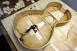 Botten fick en mittsticka i rosewood för att kompensera för krympningen. Halsklossen var ovanligt liten och fick en förstärkning inlimmad. Man hade slarvat rejält med kerfingen runt sargen och jag fick limma in flera bitar där det fattades och fylla i urjackningen för de gamla ribborna. Jag hoppade över ribban under stallplattan i locket för att inte göra locket för styvt.